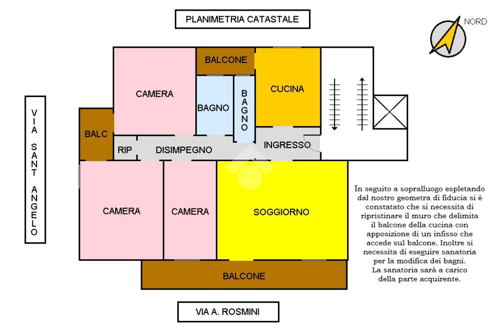 In seguito a sopralluogo espletando da un nostro geometra di fiducia si è constatato che si necessita di ripristinare il muro che delimita il balcone della cucina con apposizione di un infisso che accede sul balcone. Inoltre si necessita di eseguire sanatoria per la modifica dei bagni. La sanatoria sarà a carico della parte acquirente.