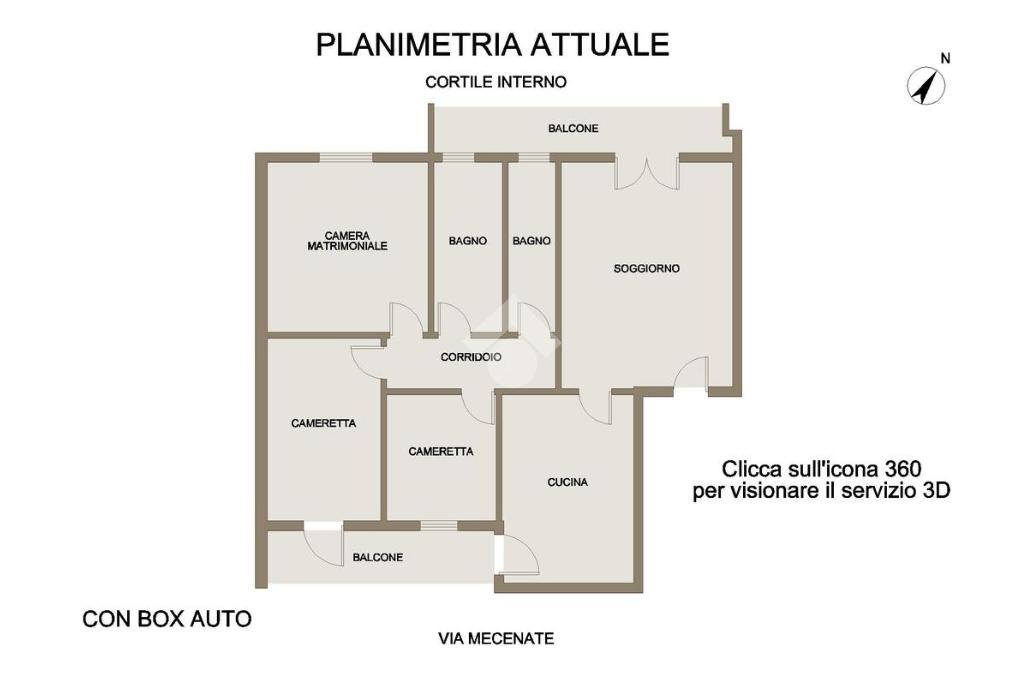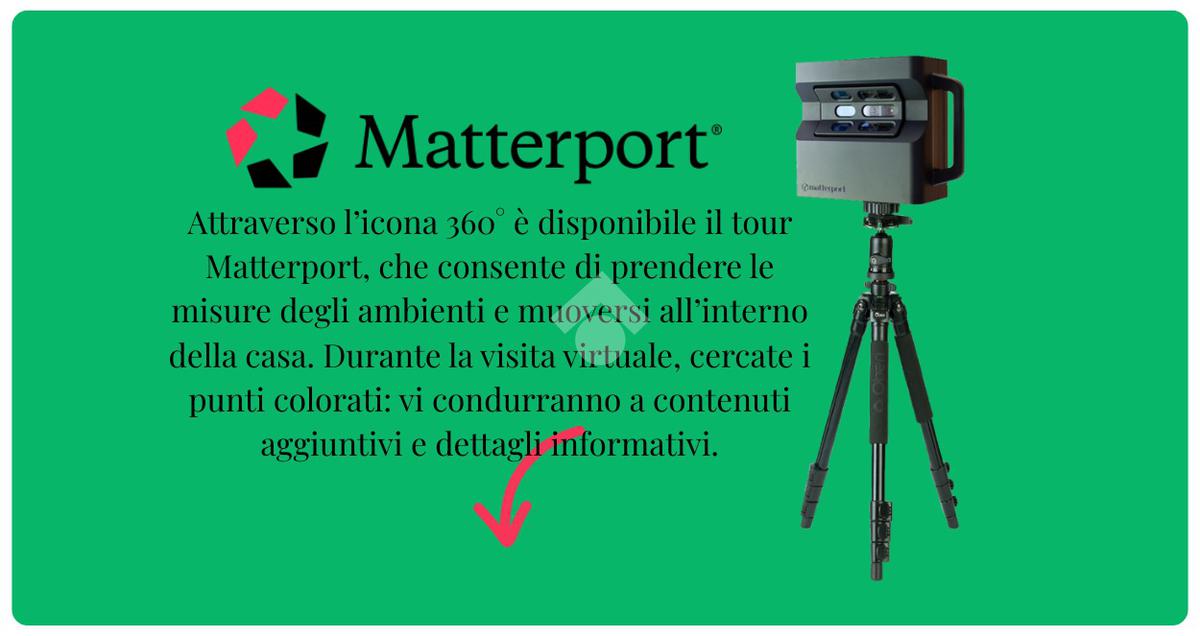 Nell'icona 360° troverete il servizio Matterport per prendere le misure e camminare in casa. Nei tondini colorati dove troverete contenuti e dettagli.